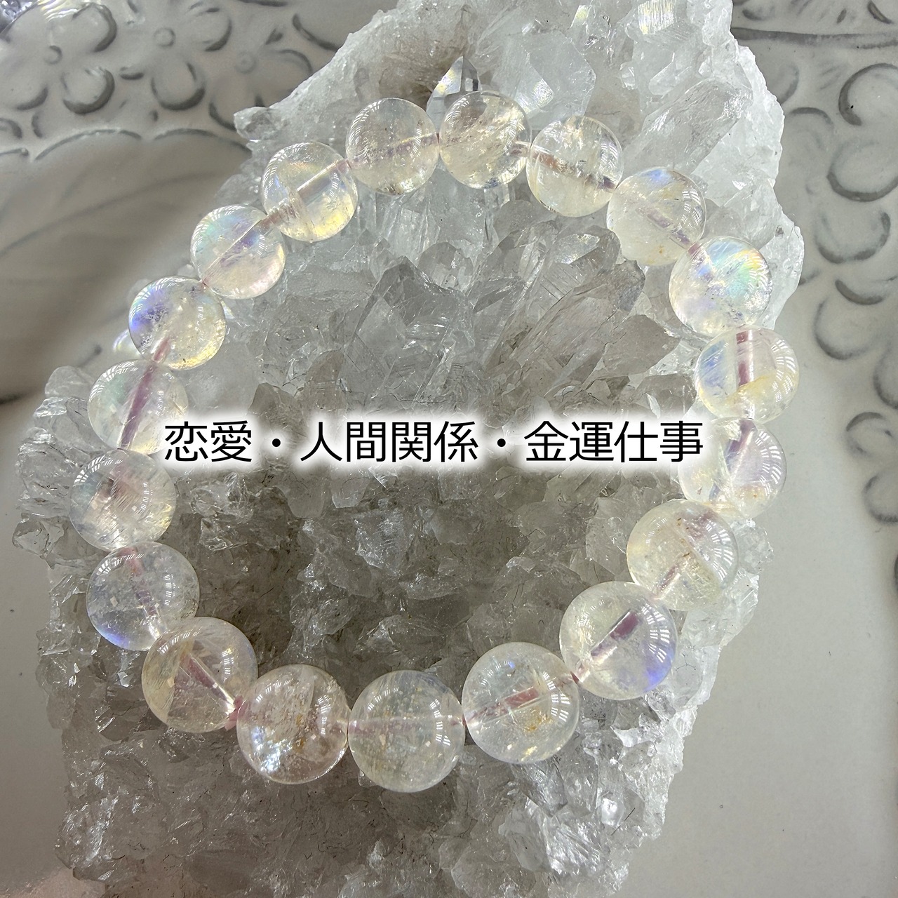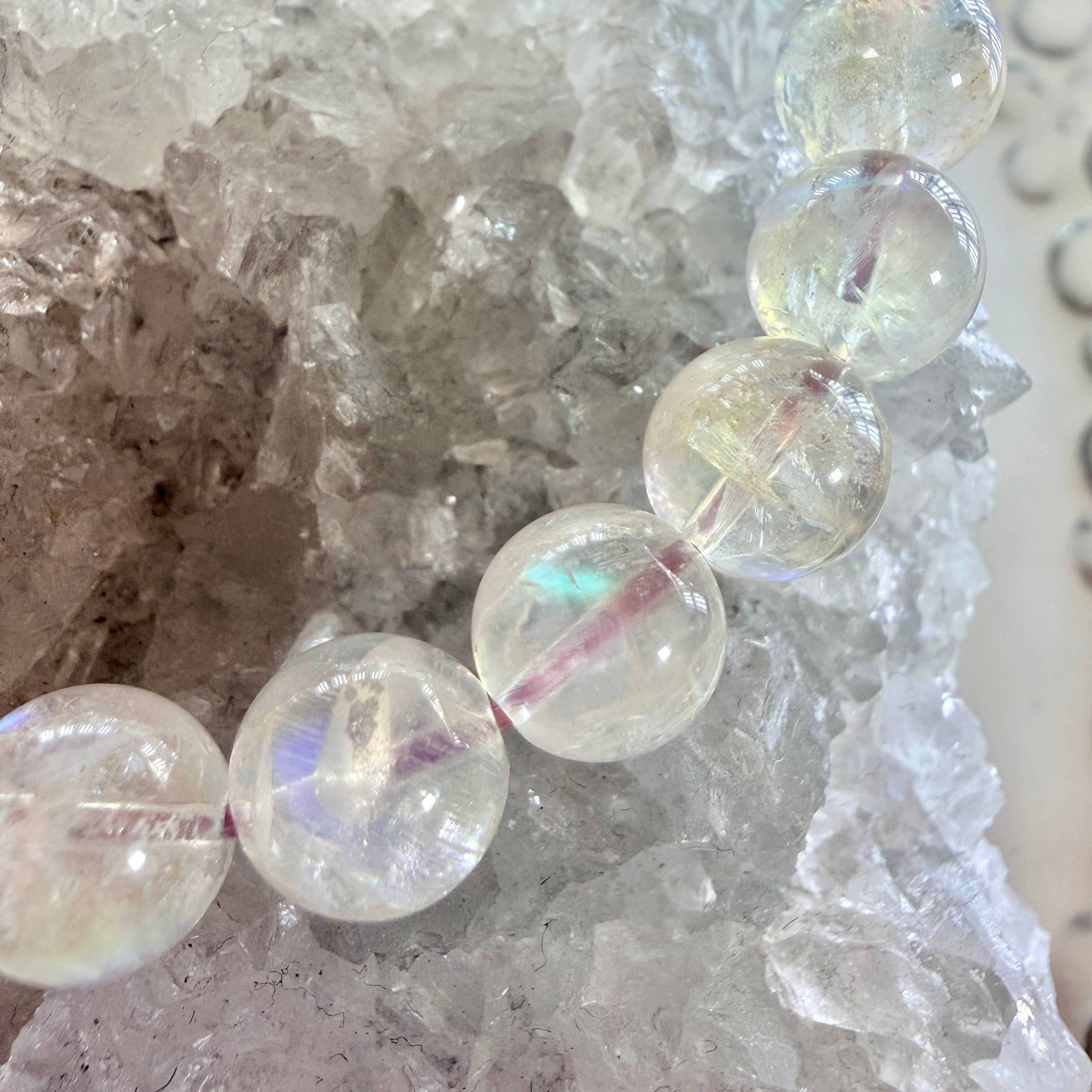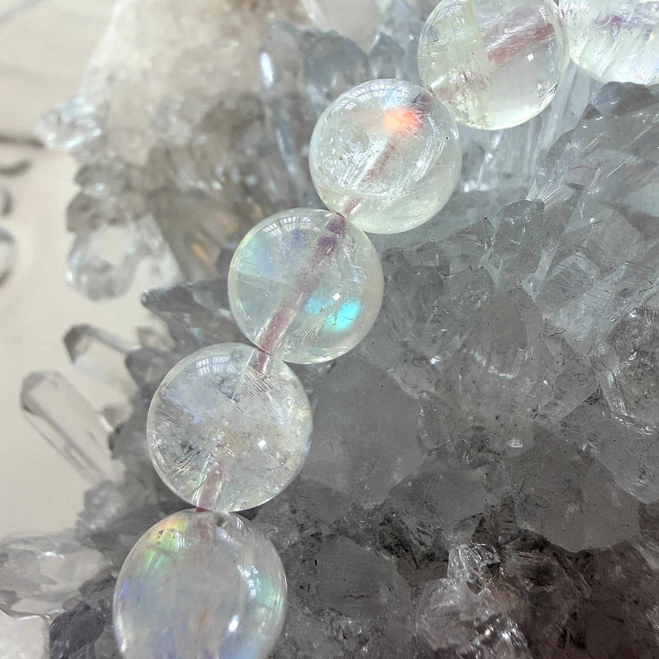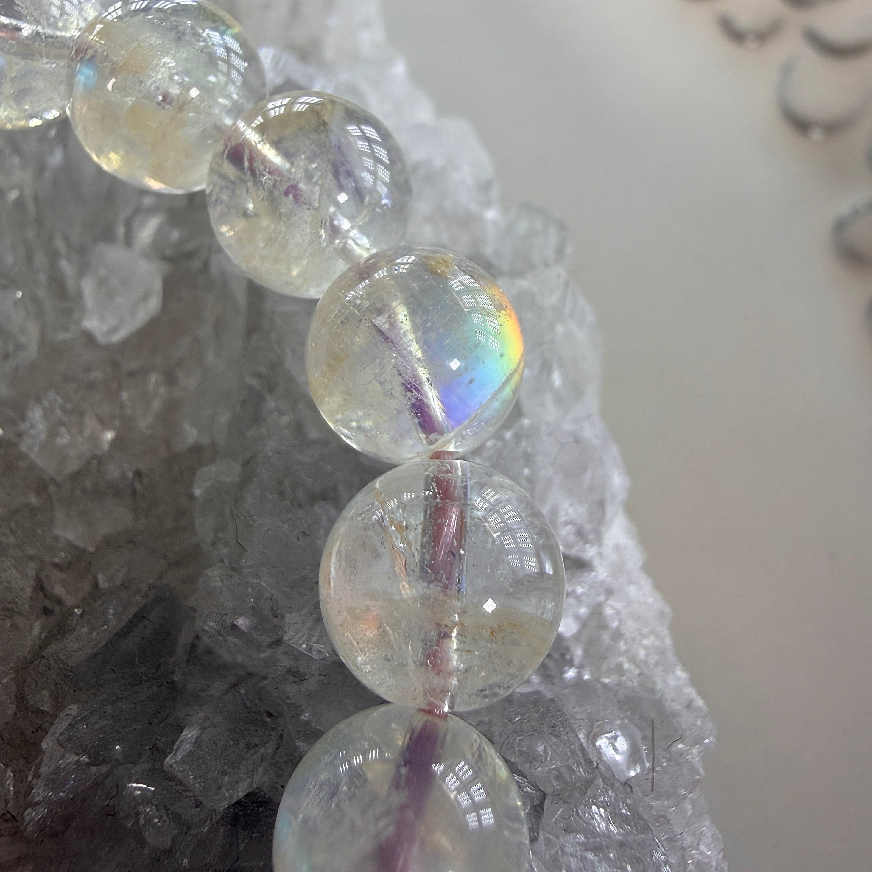今回セレクトしたのは非常に高品質なAAAAAグレードで透明感が高く、全部の珠に様々なカラーのレインボーシラーを確認できます。