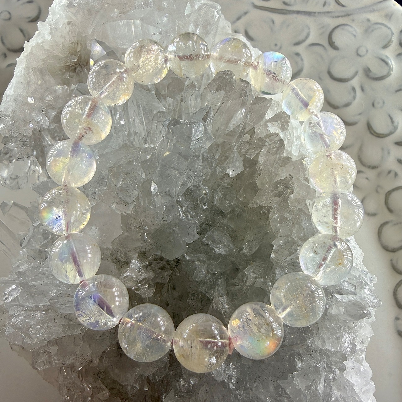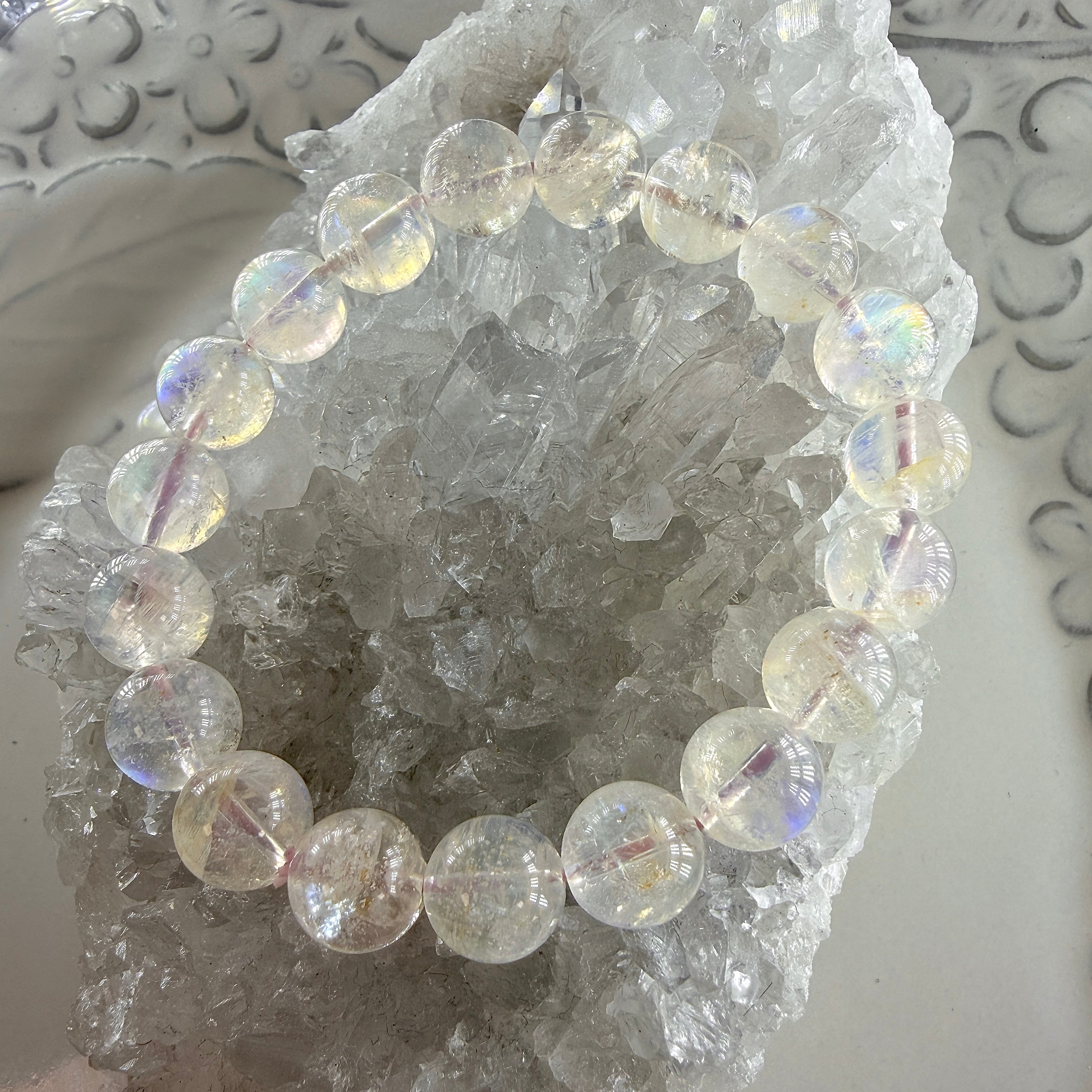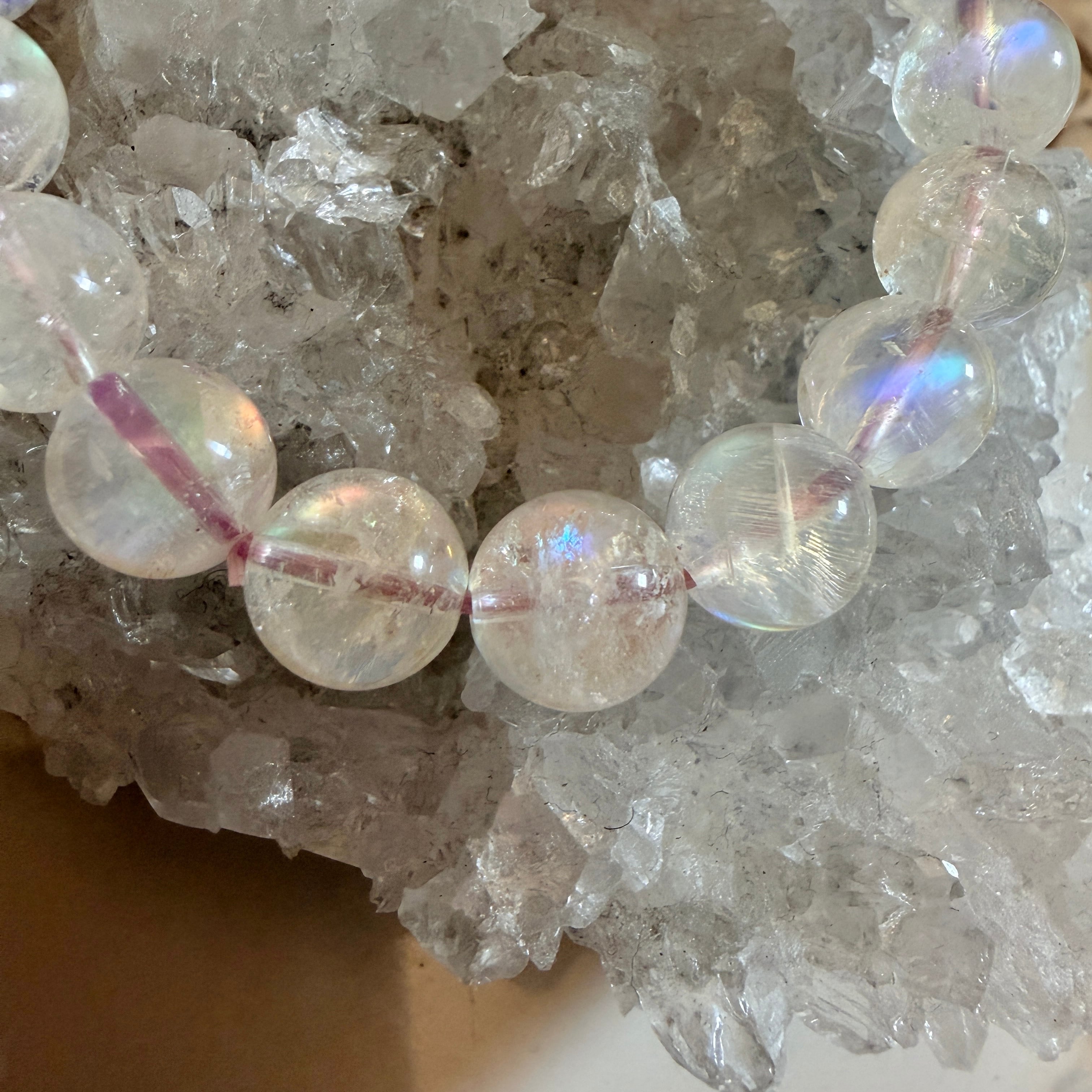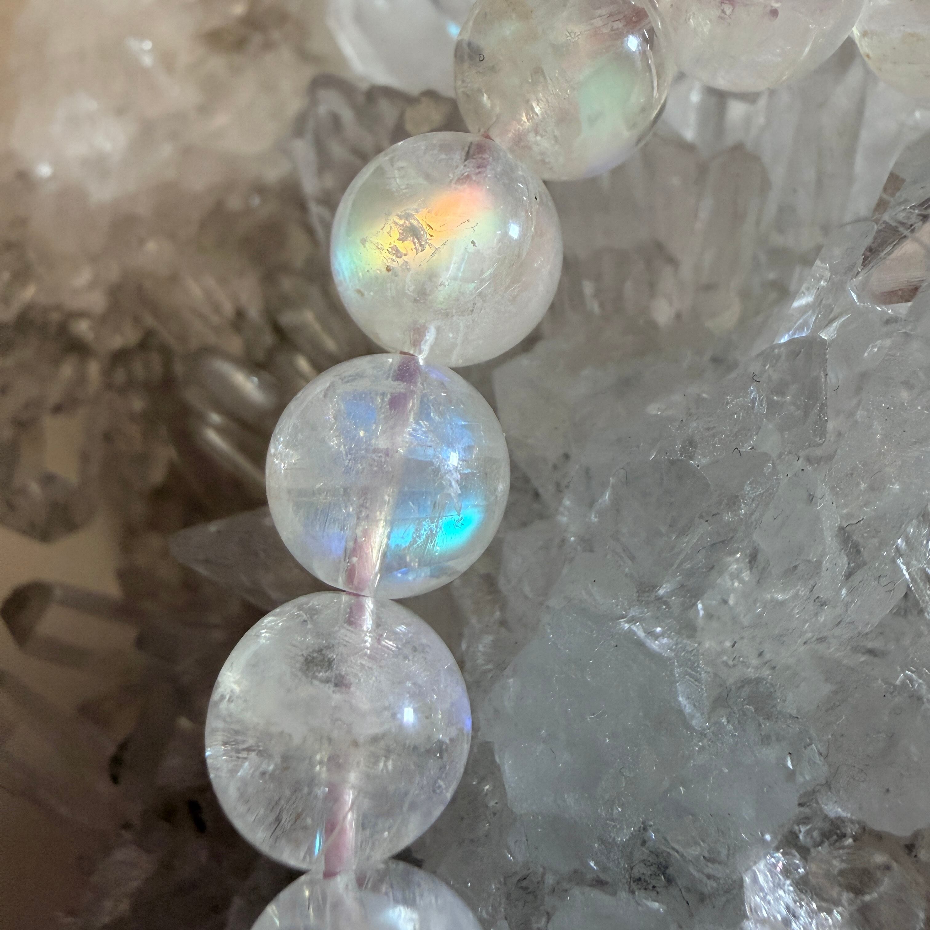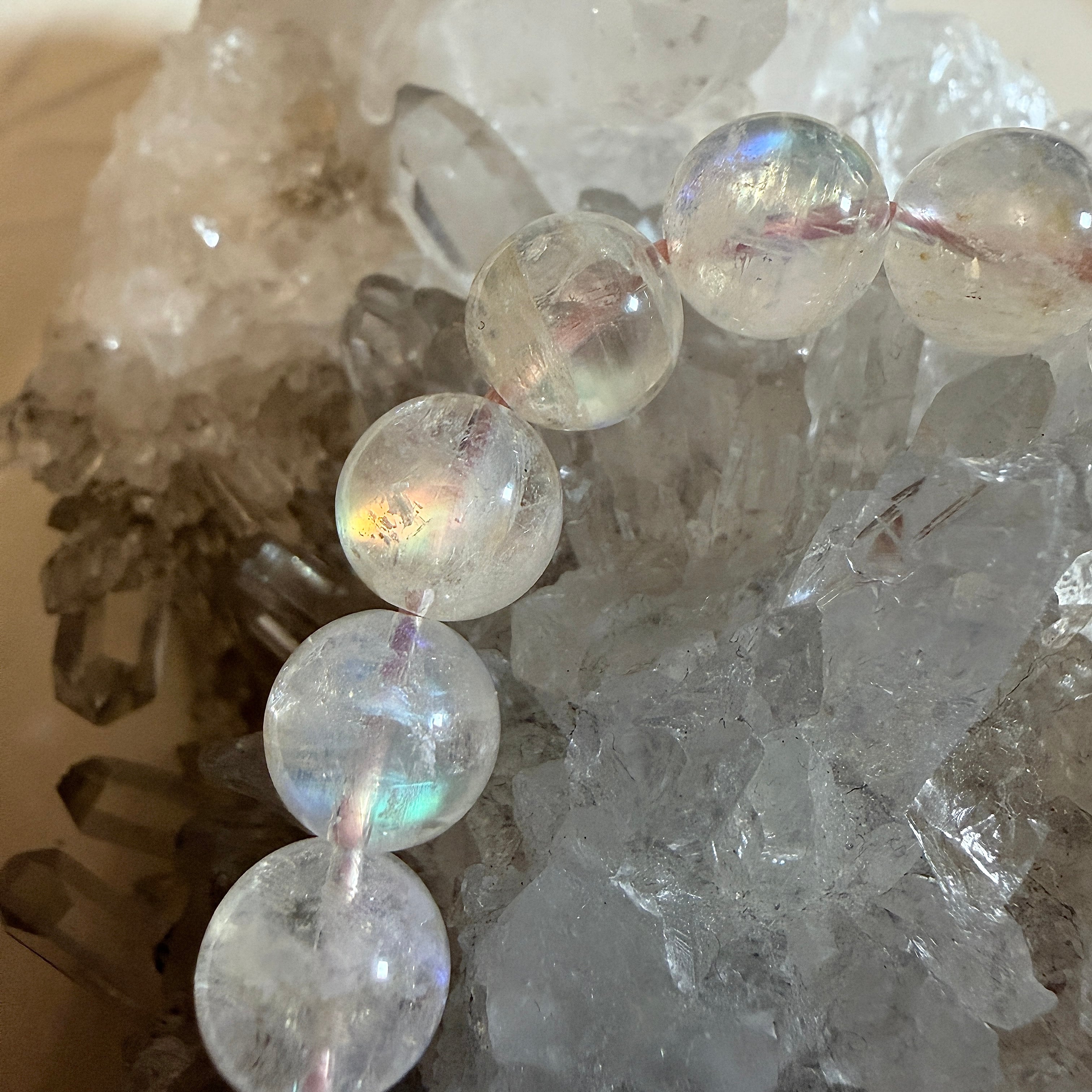 今回セレクトしたのは非常に高品質なAAAAAグレードで透明感が高く、全部の珠に様々なカラーのレインボーシラーを確認できます。