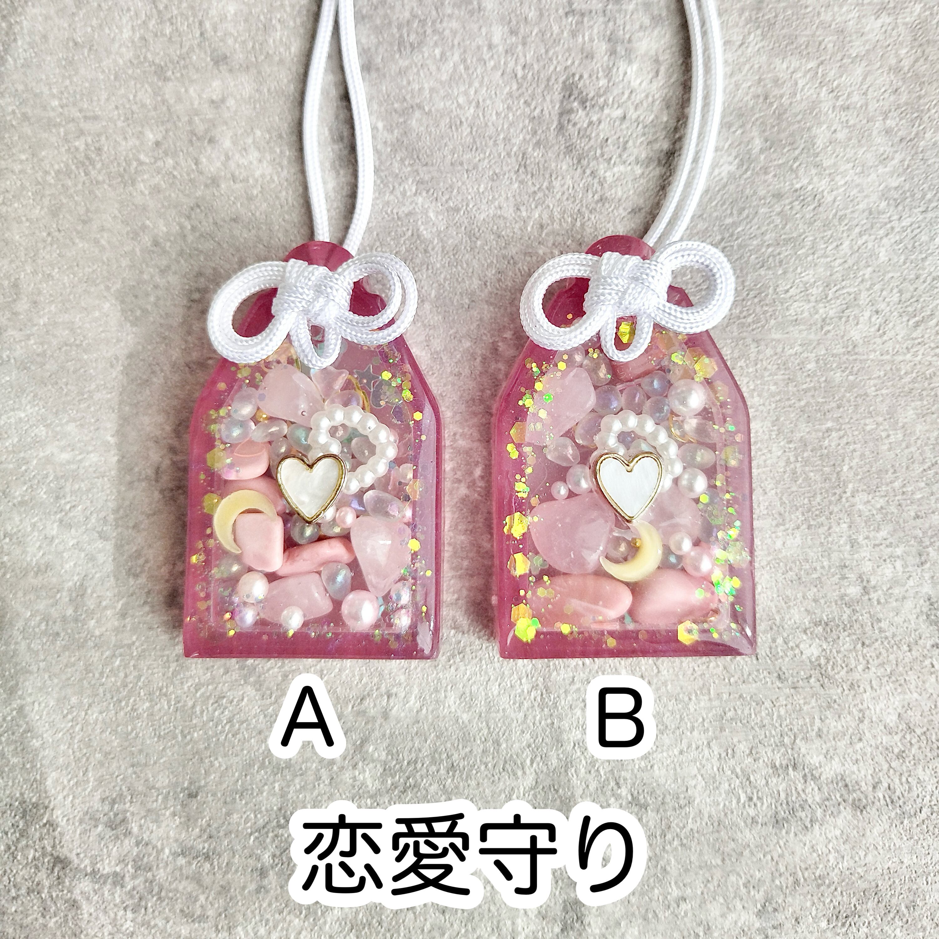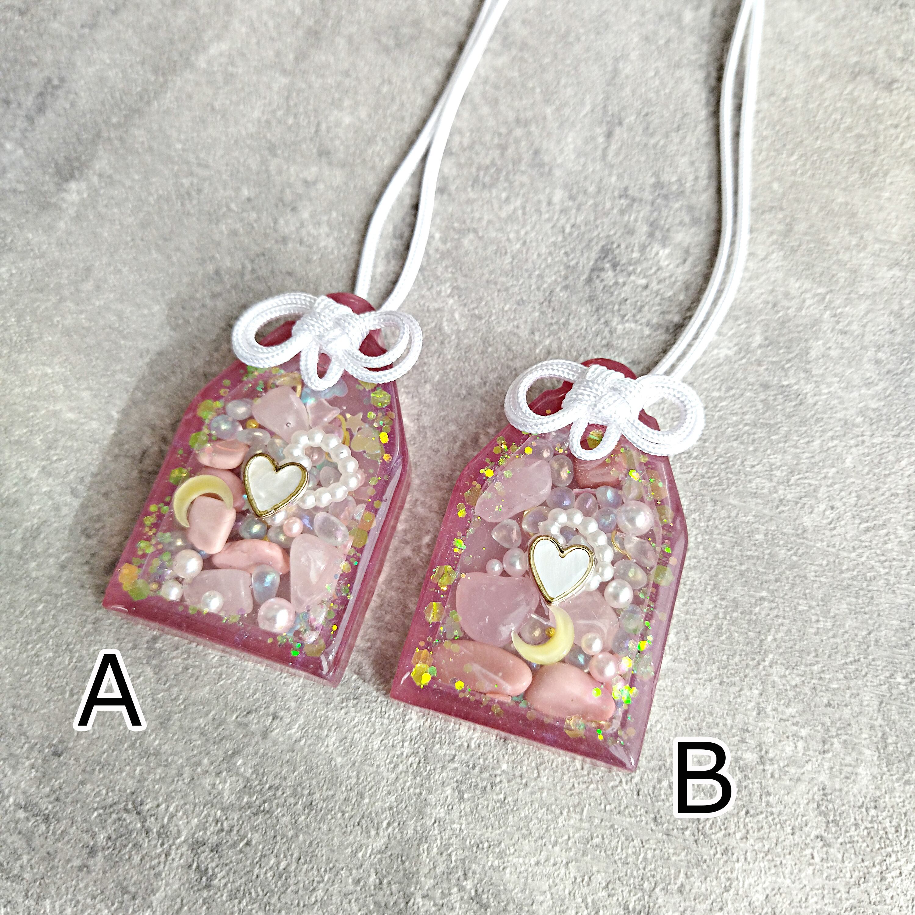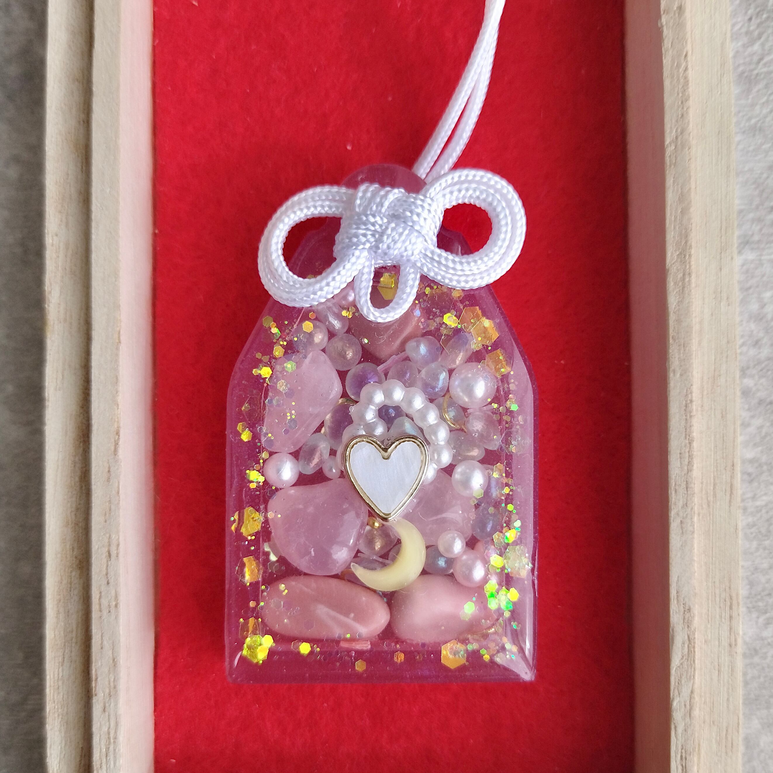 ローズクオーツ、ピンクオパール、ムーンストーンを使った恋愛のお守りです。