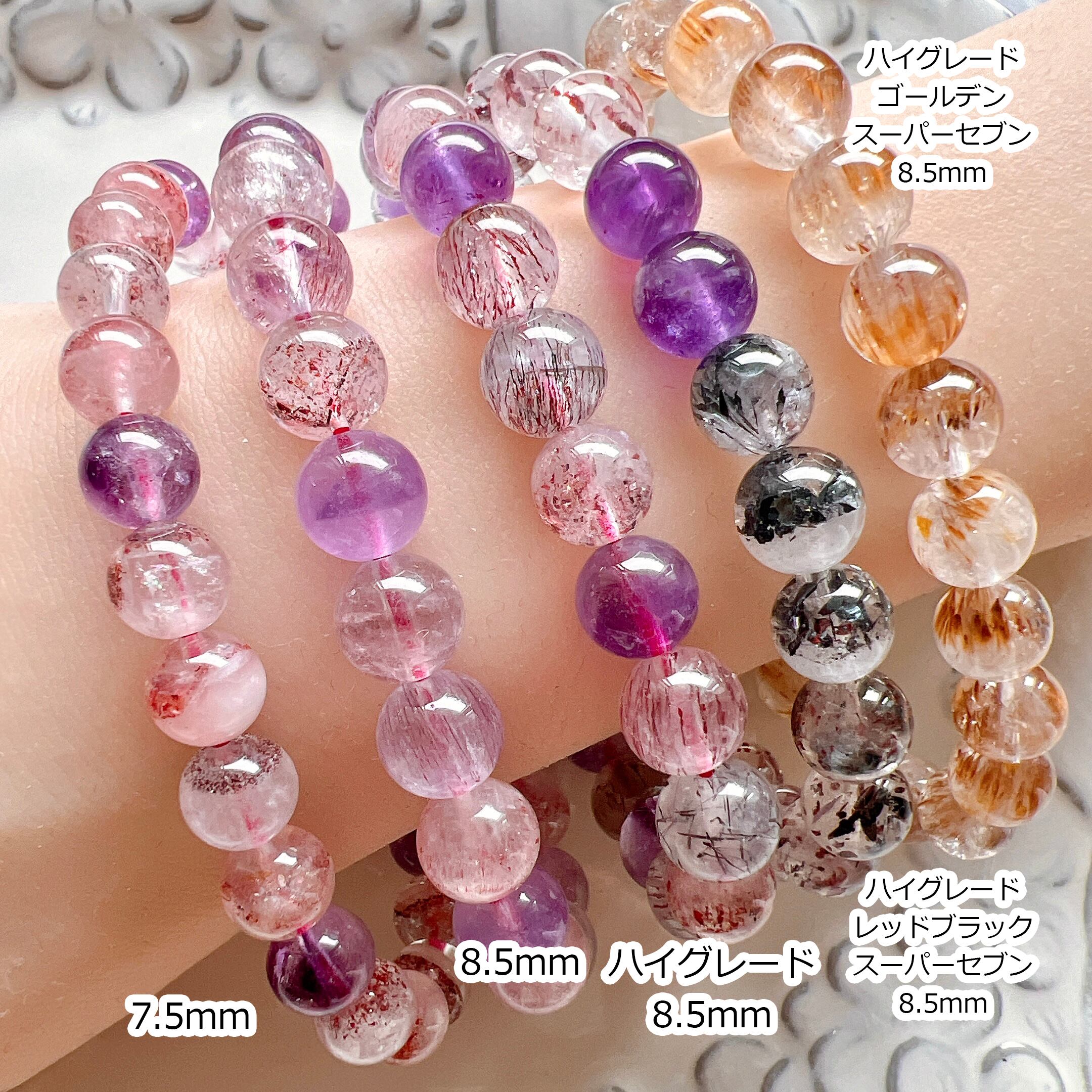 スーパーセブンは水晶にゲーサイト・アメジスト・スモーキークォーツ・ルチルクォーツ・レピドクロサイト・カコクセナイトの7つが内包された天然石です。一般的に流通しているスーパーセブンは、上記の7つの鉱物を全て含んでいるものは非常にまれで、多くは原石の段階で7つの鉱物を全て含有しているものをカットや加工した石をスーパーセブンと呼んでいます。