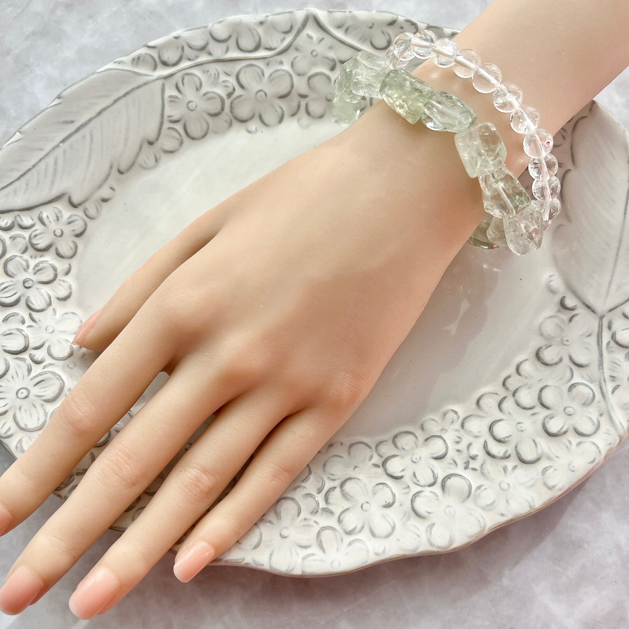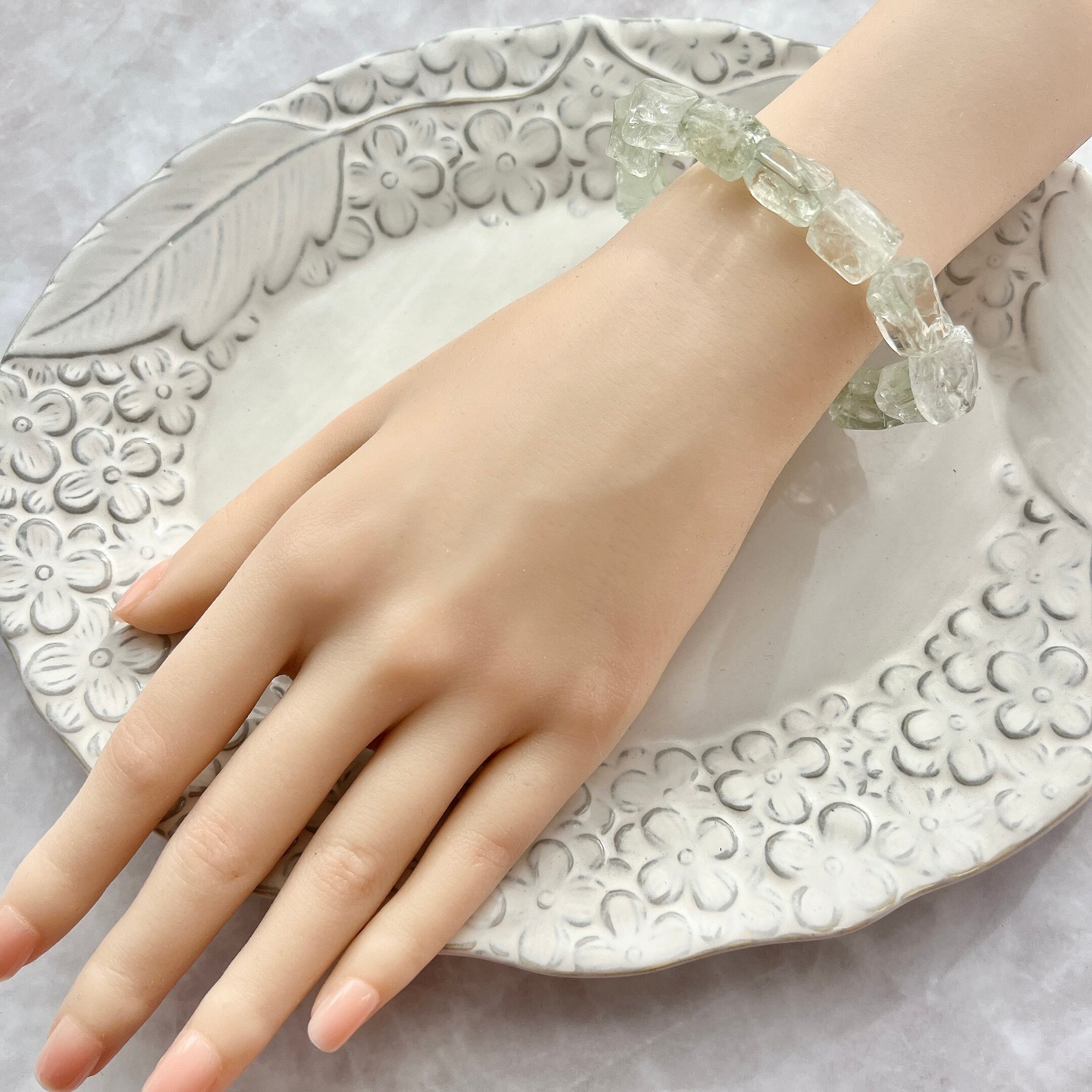 【恋愛・金運仕事・人間関係】15.5cm透明美☆グリーンアメジスト原石カットブレスレット(1点物)