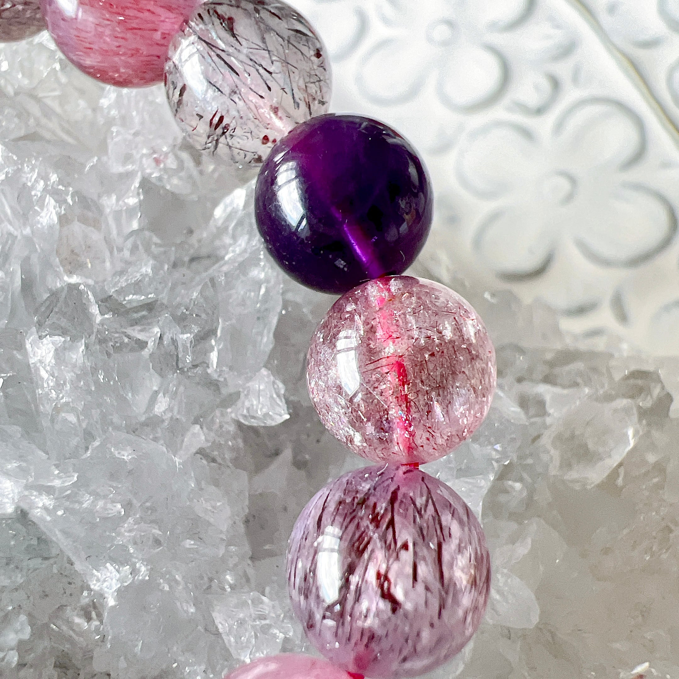 マルチカラーで内包ぎっしり、アメジストの発色も美しく、AA9.5mm珠で見ごたえたっぷりな極上の1本をセレクトしました。